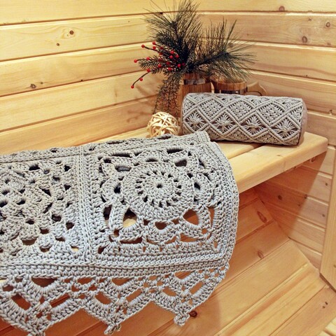 Ковер и подушка «Жить здорово!» Ковер и подушка ручной работы сделают комнату отдыха в бане, квартире или доме уютной, теплой и современной. Ковер идеально ровно ложится на полу или полке в бане. Его не придется выправлять, выравнивать, профессиональная вязка мастерицы не оставит равнодушным даже самого взыскательного покупателя. Комплект 'Жить здорово!' можно приобрести по частям. В этом случае стоимость каждой позиции уточняйте по телефону 8 800 500 49 65.
